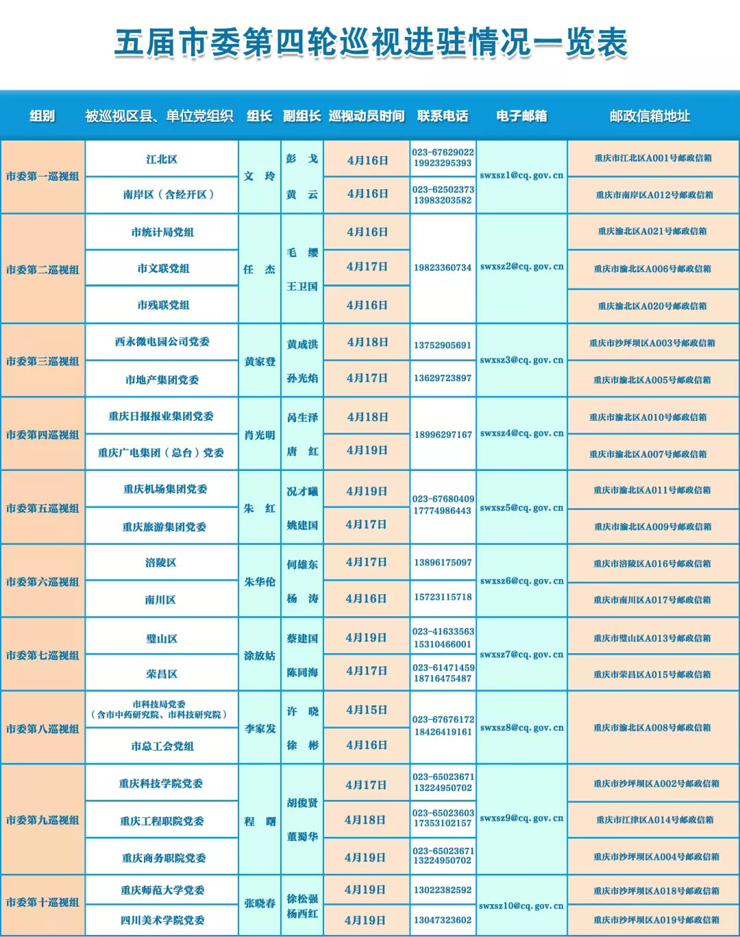 截至4月19日,市委各巡视组已全部进驻被巡视区县、单位,分别召开了与被巡视区县、单位党组织主要负责人的见面沟通会、巡视工作动员会。市委巡视工作领导小组成员参加会议,传达了市委书记陈敏尔关于巡视工作的讲话精神,对即将开展的巡视作动员讲话;巡视组组长通报了巡视任务。
